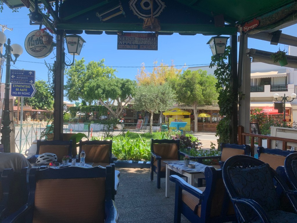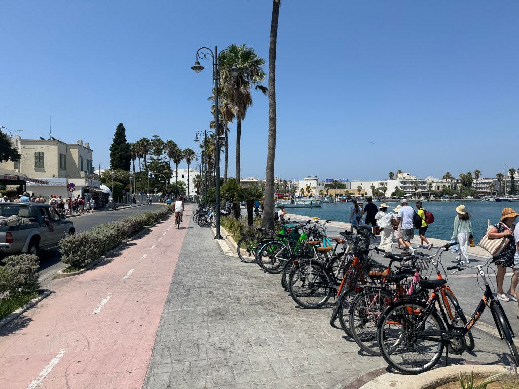 Üçüncü seyahatimde feribot iskelesinin karşısındaki bisikletçiden bir bisiklet kiralayarak şehir merkezi ve çevresinde tur atmaya karar verdim. Sabah çok yorgun olarak kalkmış olmama ve sıcak havaya rağmen pes etmeyip fırsat varken adanın daha önce görmediğim güneydoğu sahiline doğru… Önce Elefterias Meydanı’ndaki kafelerden birine oturup altlık olarak biraz kahve ve su içtim. Çevrede kahvaltı eden yerli ve yabancı misafirler vardı. Yunanlı garson önce İtalyan zannetti beni, hatta yanındaki de “Bongiorno, Kalimera – ikisi de aynı şey” gibisinden bir şey söyledi ona… Kahvemi içip biraz nefeslendim. Sonra yolda bir 100 Euro’luk döviz aldım ardından bakkala uğrayıp bir büyük su alıp bisikletçiye döndüm. Bir bisiklet seçtim oradaki görevliyle konuşup, depozitoyu ödedim ve yola çıkıp önce sahilin yukarı tarafına, plaj ve beach club’ların olduğu tarafa doğru direksiyon kırdım. Gayet rahat, kullanışlı bir bisiklet yolu vardı.
