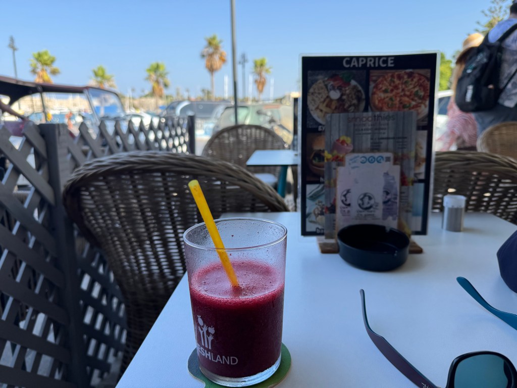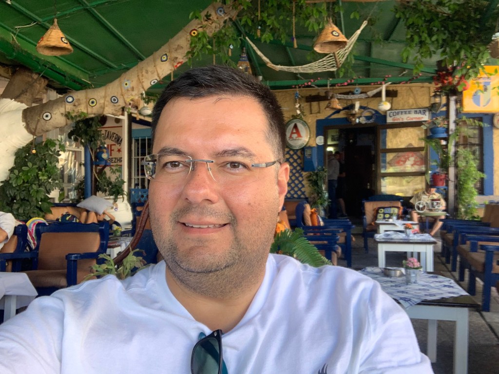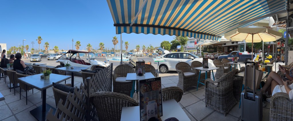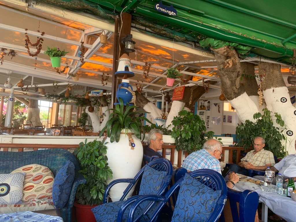 Bordum’dan gelmeden önce adada gidilmesi önerilen plajların listesine bakmıştım. Güneydoğu ucunda Agios Phokas (Aya Foka Burnu’nda) plajda bulunan beach bar’ı seçtim. Gin’s Corner Bar’da bir yarım saat kırk dakka kadar oturduktan sonra taksiyle oraya gittim. Bu plajın denizi güzel, berrak ve sakin. Türkiye’nin Datça sahillerine bakıyor. Barı ve restoranı da güzek, kalabalık değil, Türklerin pek uğradığı bir yer değil – gerçi o gün tesadüfen orda bulunan aslen İstanköylü olup İstanbul’da aynı lisede okuduğum bir arkadaş ve ailesiyle karşılaştım. Sohbet edip yemek yedik, birşeyler içtik. Bu plaja arabayla gelmek daha uygun çünkü adada Uber ya da Bolt gibi uygulamalar yok, dönüş sıkıntı olabiliyor. Arkadaştan aldığım numarayla bir taksi durağından araba çağırdım, uzun süre beklememe ragmen gelmedi… Plajın yakınında Allahtan bir otobüs durağı da var, ordan şehir merkezine giden bir otobüs geldi, anca öyle dönebildim.