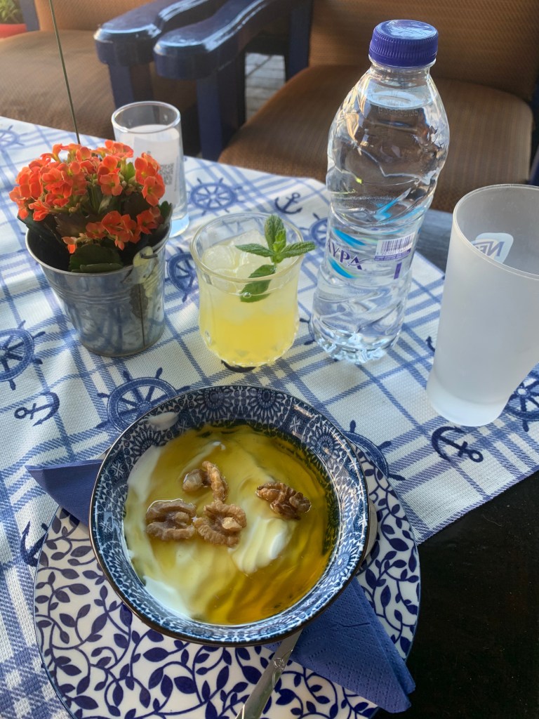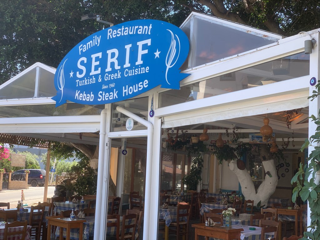 2000li yılların başındaki ilk gidişimde Ali Bey’in büyük oğlu ara sıra Rumlardan gelip lafla taciz edenler olsa da idare ettiklerini, hepsinin evlerinde çanak antenle Türk televizyonlarının izlendiğini ve Türk dilini yaşatmaya çalıştıklarını söylemişti. Konuşmamızdan biraz sonra bir Yunan askeri cipi geçmişti yoldan, ardından bisikletiyle gelip baharat satan sakalı bıyığı uzamış bir Rum köylü özellikle restoranın önünde durup uzun uzun “oreganos” (kekik) diye bağırmıştı, isteyip istemeyen olduğunu merak etti herhalde. Yemekten sonra Ali Bey’e ve oğluna teşekkür edip kalkmıştım. İkinci gidişimde Ali Bey’in küçük oğlu oradaydı, Türk garsonlarla da merhabalaştık, biraz sohbet ettik. Yemeğin sonunda da sahipleri kahve ikram ettiler. Salata, “Giourtlou” ve Soda toplam 16 Euro tuttu.