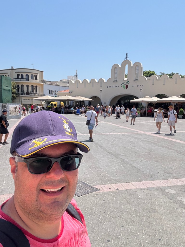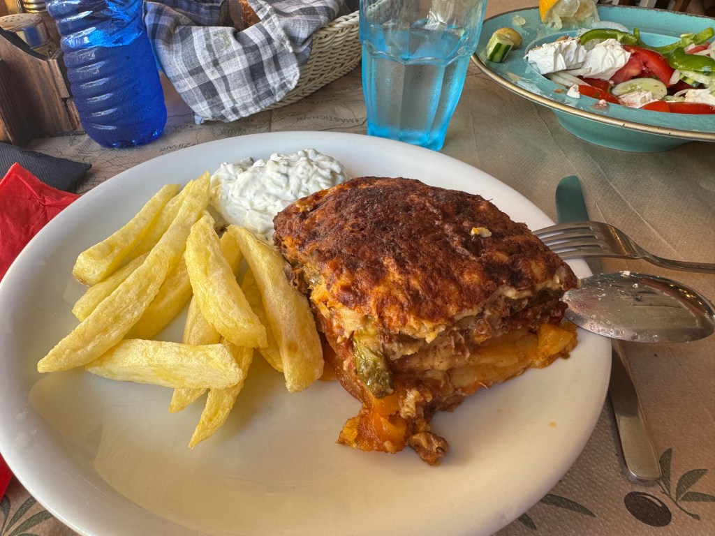 Dağdan aşağıya inişte Tigaki köyünden geçtik. Burası sahili güzel bir belde; geniş plajları, otelleri ve beach clubları var. Yolda rehberimiz otobüsün müzik-çalarından bize Yunanca yerel ezgiler dinletiyordu, biraz bizim Türkçe arabesk parçalara benzeyen; hatta onlardan birini “size armağan ediyorum” dedi J Türkçe tabirleri, adetleri ve günlük hayatta kullanılan lafları iyi bellemiş hakikaten İrin Hanım. Şehir merkezine gelince limanın arkasında otobüs bizleri bıraktı, herkes rehberle vedalaşıp ayrıldı. Vakit öğleni bir hayli geçtiği için acıkmıştım, hızlıca yürüyerek ta 18 sene önce Germe (Platani) köyünden tanıdığım Ali restorana gittim. Oradaki öğlen yemeğinin ardından adada görmek isteyip Google’a işaretlemiş olduğum yerleri gezmeye çıktım.