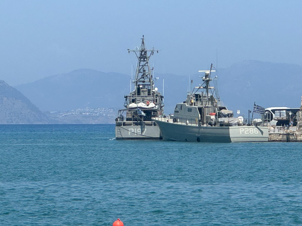 Yolda benim gibi birçok turist gördüm, yayalar da gelen geçenlere alışık olduğu için sıkıntı çekmeden arka yollardan olsun sahil tarafından olsun rahatça sürüş yaptım. Adanın kuzey doğu sahilindeki Lambi plajını takip ederek Türkiye’ye en yakın nokta olan burna kadar geldim ancak burada bir askeri birlik olduğu için daha öteye gidemedim. Dürbünle baktığımda Bodrum-Akyarlar ve Kos arasında devriye görevi yapan FRONTEX’in Danimarka bayraklı bir botu gözüme ilişti. Suriye savaşından sonra artan düzensiz göçmen akınını önlemek için Avrupa Birliği sınır bölgelerinde böyle önlemlere başvuruyor.
